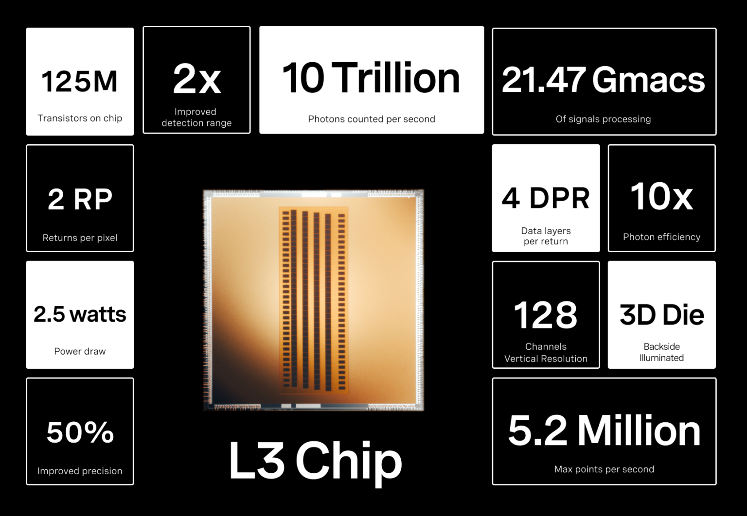 Разработанный с использованием ультрасовременной 3D-подсветки задней поверхности, L3 обладает невероятными возможностями обработки, потребляя при этом меньше энергии, чем предыдущие поколения датчиков. Датчики REV7, оснащенные чипом L3, создают потрясающие облака точек и выделяют физические детали, которые остаются невидимыми для других лидарных технологий.